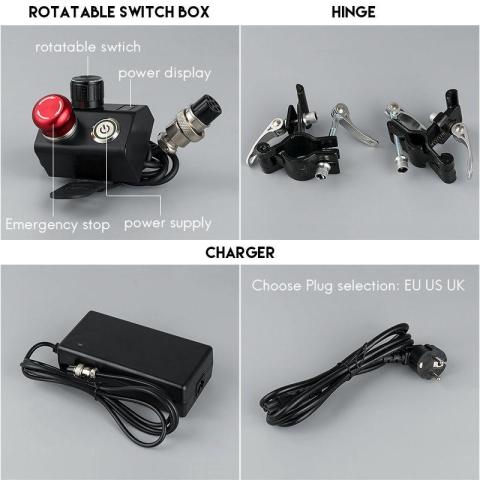 Included: remote control, charger, two spare wheelchair mounts, a tube for indoor wheelchairs, and two spare rubber bands for the remote control. The remote has three speed settings and is very easy to operate.
